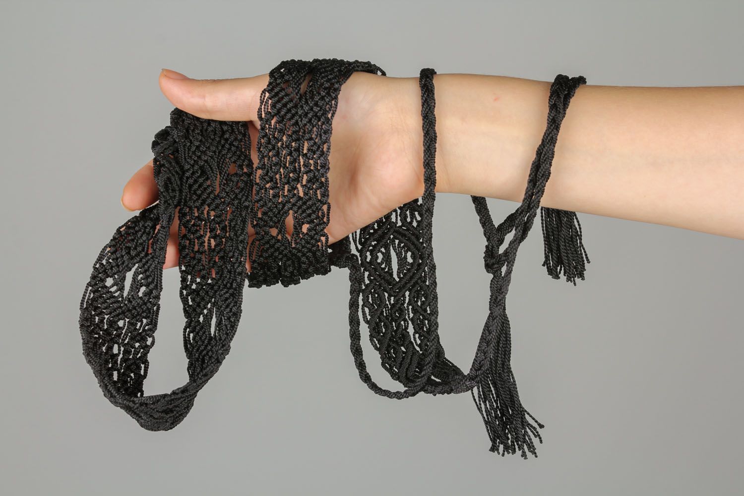 Gestrickter Gürtel ist aus den synthetischen Fäden in Makramee geschaffen. Zierlicher Gürtel ergänzt Ihr Kleid, Tunika oder langes T-Shirt. Gürtel Textil ist in schwarz ausgeführt. Alle Farben sind möglich.