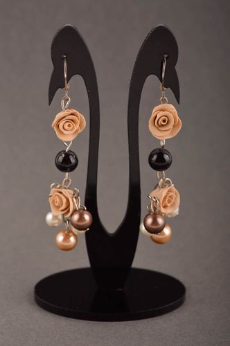 Long handmade drop earrings with flowers made of polymer clay for stylish women
