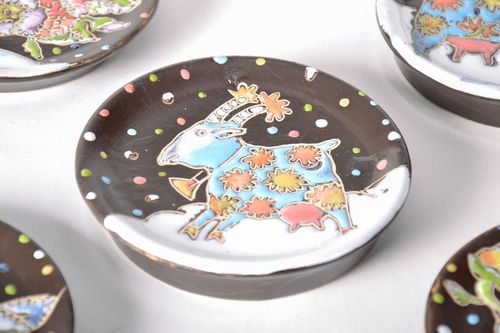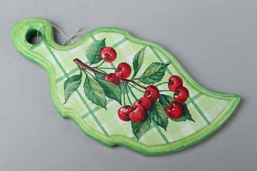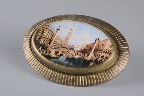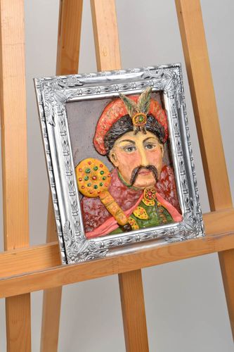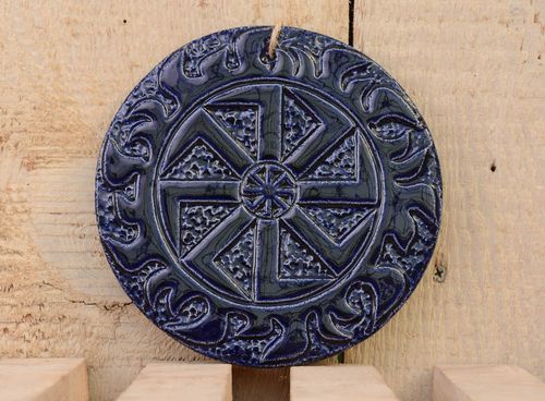 Broad handmade wooden wrist bracelet with geometric ornament with intarsia