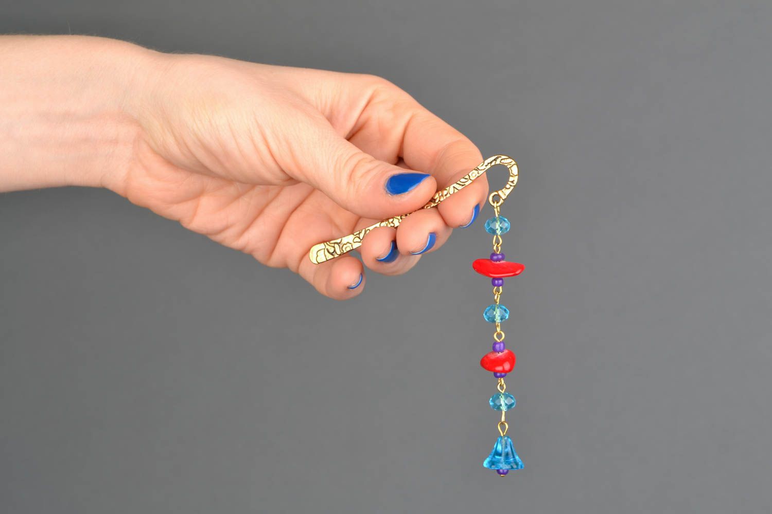 This designer bookmark is made of metal of golden color. It is decorated with plastic and glass beads. But the main highlight of this accessory is the beads made of natural coral. Let the process of reading of the new book will be also stylish - choose this handmade bookmark.