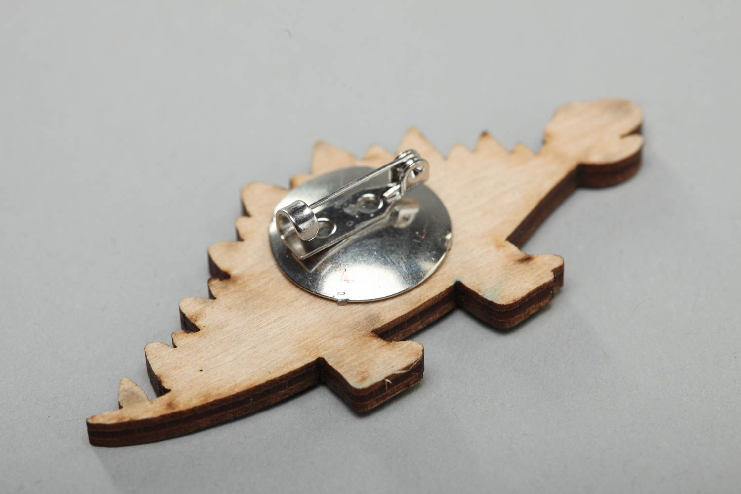 This plywood brooch is decorated with outlines applied using pyrography technique. It is painted with acrylics manually. This brooch is appropriate for both girls and boys as it looks as a one of the favorite animal of all children - dinosaur.