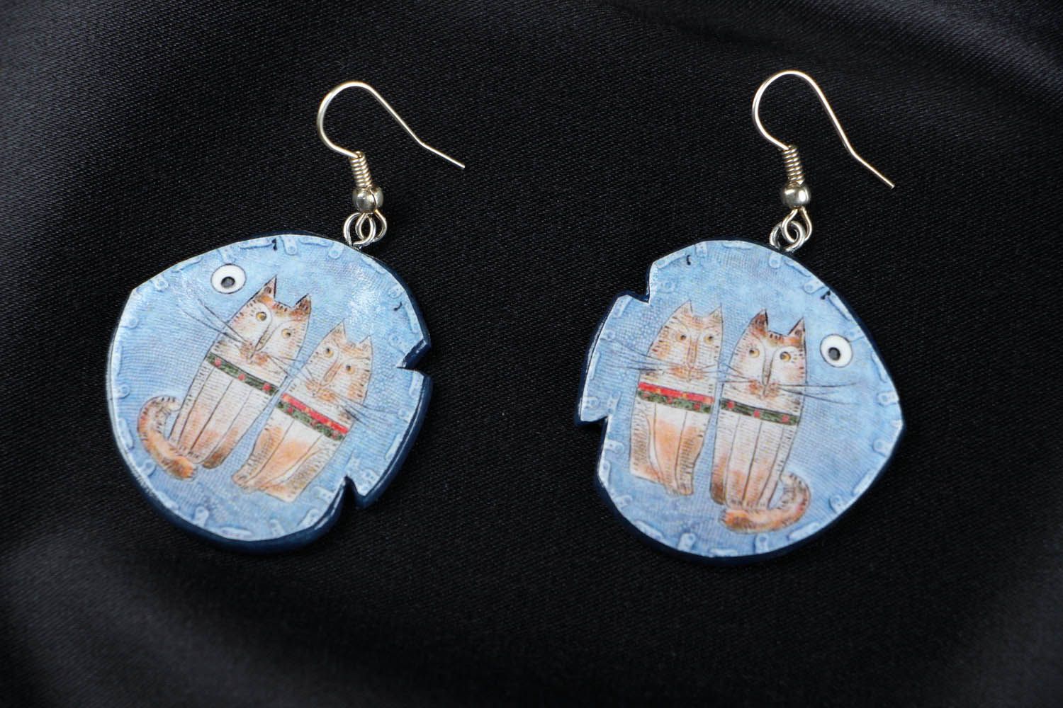 Author's earrings are made of polymer clay in the shape of small fishes inside of which imperturbable cats have made themselves comfortable. The image is on surface of the product is made using decoupage technique. The jewelry is equipped with convenient metal ear wires.