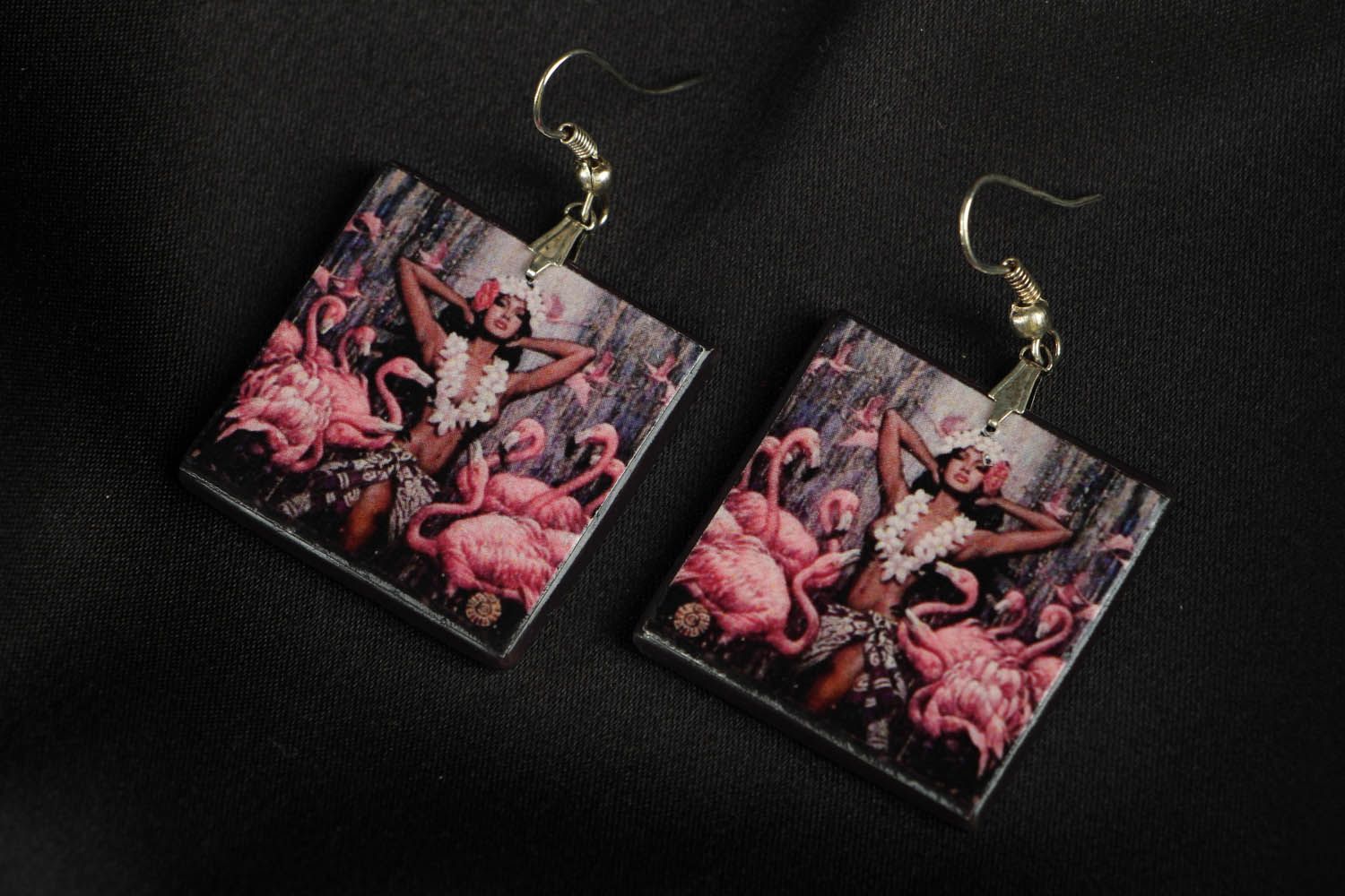 Los aretes artesanales de arcilla polimérica son una opción excelente para chicas a las que les gustan los accesorios vistosos. La imagen de haitiana caliente rodeada con flamencos está aplicada en el accesorio en técnica de decoupage. Los pendientes originales están equipados con fornitura metálica.