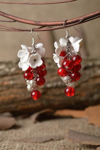 Longues boucles doreilles avec fleurs rouges en pâte polymère faites main